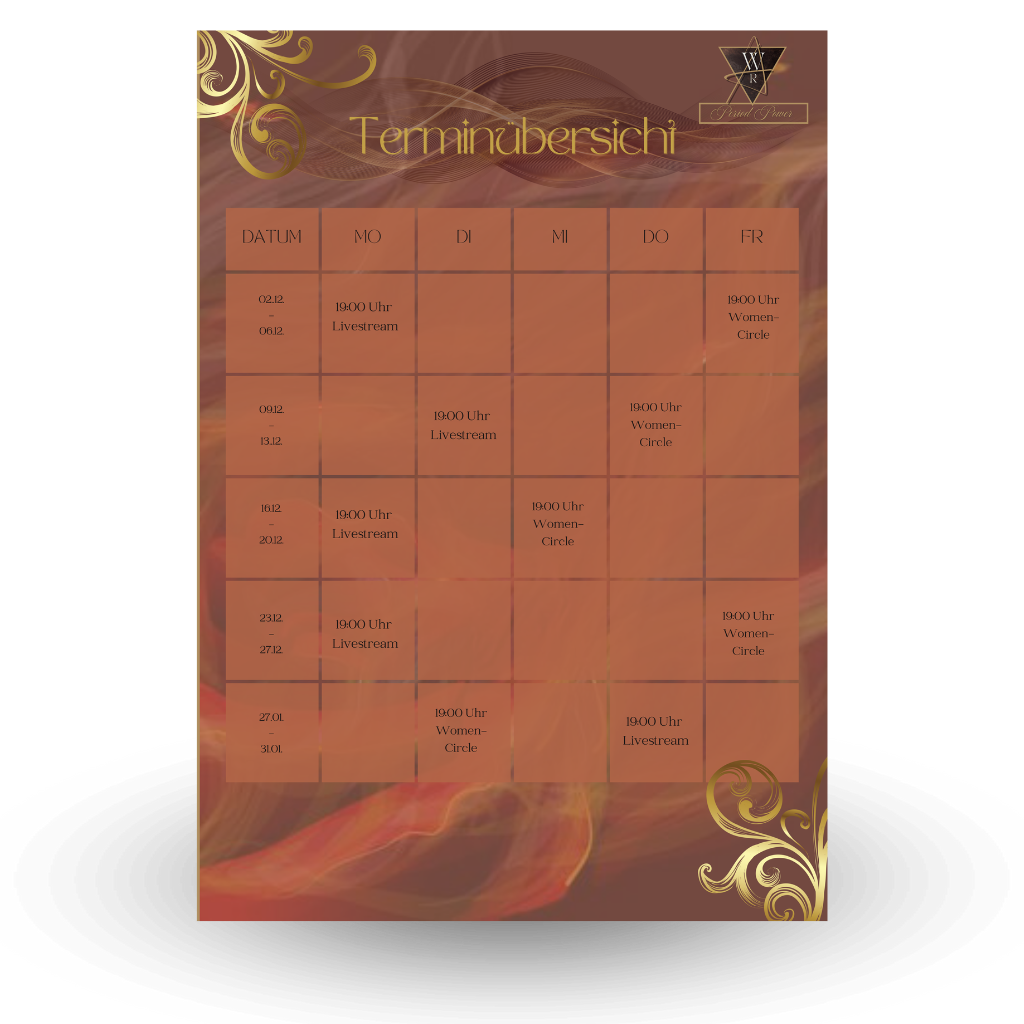 Die nächsten 4 Wochen sind so aufgebaut, dass einmal wöchentlich der Livestream mit Jackie über Zomm stattfindet. Daneben findet einmal in der Woche der Women Circle über Zoom statt.